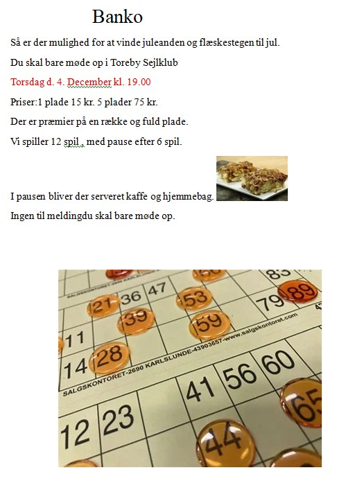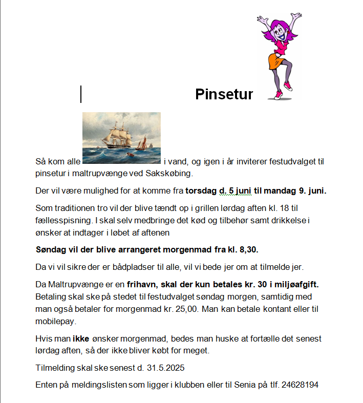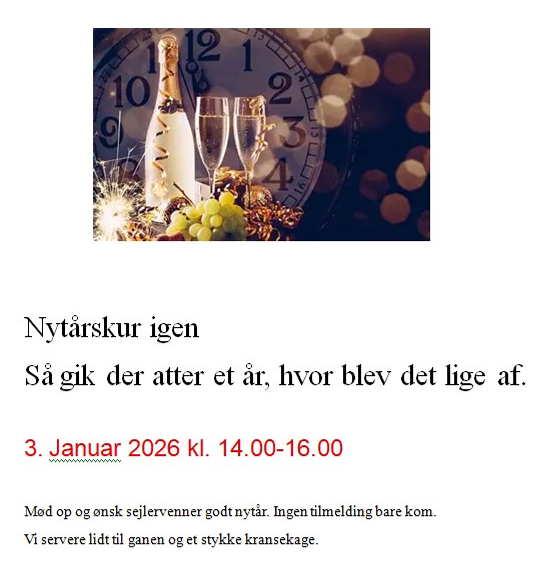 Vi sejler ud om formiddagen og gør et stop i Guldborg, hvor vi nyder en fælles frokost. Når vi vender hjem til klubben, venter der kaffe og kage som en velfortjent afslutning på en forhåbentlig dejlig dag.